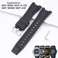 Ремінець для годинника Casio G-Shock GST-W300 виконаний з полімеру білого кольору. Має класичну форму з двох половинок, довжину 21,2 см та ширину 23 мм. Оснащений сріблястою пряжкою для зручного закриття. Підходить для моделей GST-W100G, W110, W130L, W300, W300G, S110, S100G, S300, S300G, S210B, B100 та 410G. Вага ремінця складає 18 г. Гарантія – 1 місяць.