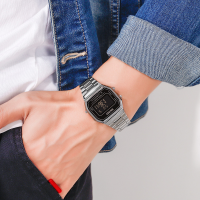 Цей електронний годинник має прямокутний корпус розмірами 38 х 35 мм і оснащений полімерним склом. Він пропонує різноманітні функції, такі як будильник, календар і секундомір, а також електролюмінесцентне підсвічування для зручності використання в темряві. Циферблат з арабськими цифрами відображає години, хвилини, секунди, а також день тижня, місяць і число.